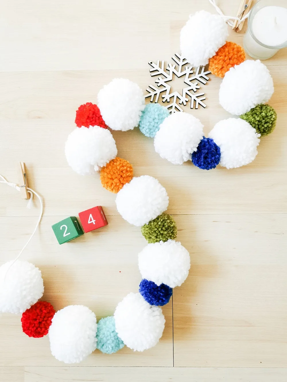 Consta de 22 pompones medianos intercalados con pequeños pompones de color: rojo, azul turquesa, azul obscuro, verde olivo y amarillo ocre. La guirnalda navideña multicolor es ideal para tu casa o área de juegos de tu bebé o toddler. Todo es elaborado a mano