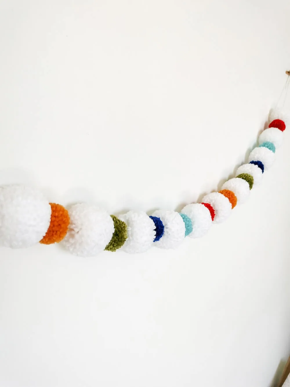 Los pompones están elaborados con estambre de colores: amarillo ocre, verde olivo, azul, azul turquesa y rojo, intercalados con un pompón de mayor tamaño en color blanco.
